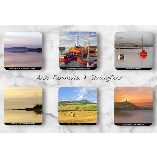 Celebrate the charm of the Ards Peninsula and Strangford with this set of six hardwood coasters, featuring some of our favourite local scenes. Each coaster is durable, glossy, and easy to clean — ideal for everyday use.